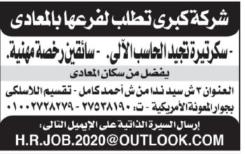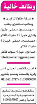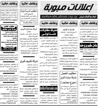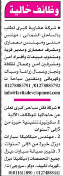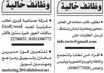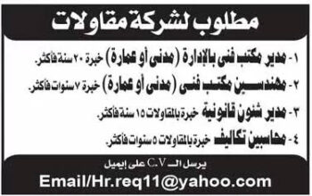 مطلوب مهندسين مشروعات و مهندسين مواقع و مدير مالي و محاسبين و مندوبين مبيعات و إمناء مخازن و عمال مخازن و بقالين و كاشير و منسق كاميرات و مراقب كاميرات و محامين مدنى و سكرتاريه و مهندسين ميكانيكا و مهندسين كهرباء